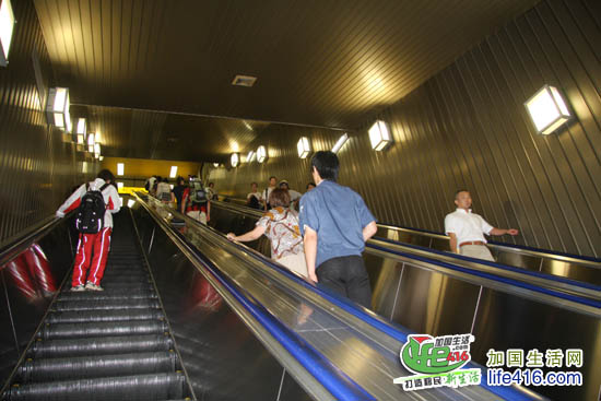 在这里要说点题外话,坐滚动电梯时是有国际惯例的,一定要留出通道让着急的人步行通过。在日本,由于车是左侧行驶的,所以人站在左侧,让出右侧让人通行;而在北美,车是右侧行驶,所以人在站右侧,让出左侧让人通行,我们在多伦多坐滚动电梯的时候就是站在右侧。不要以为这是小事,往往这些小事就能反映出一个民族的素质。