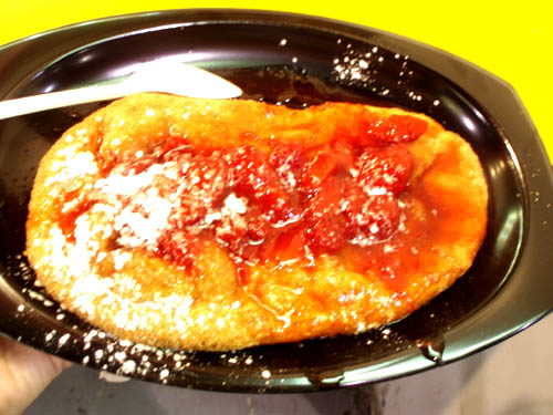 欣赏完精彩的飞行表演,顺着桥我们就摸到了举办“Let's go to the EX ” 的主会场——CNE,用人山人海形容CNE真是不过分,尤其是在加拿大更算的上热闹的场面。事先打好的地图这时候派上用场了,对照地图我们找到了FOOD BUILDING。本来以为也就是有几个FOOD COURT的东西吃,进去一看不是那么回事,简直可选的东西太多了。各国的美食都在此扎营,琳琅满目,都不知道吃什么好。我挑了一个加拿大当地的名小吃——BeaverTails,从这个名字不难猜出它的长相了吧,长长一条像是海狸的大尾巴,其实是一种炸的DONUT,吃起来外脆内香。有很多种口味,我挑的是ICING SUGAR 加草莓酱地,味道很是好。这时候怪自己胃太小,不能装下这许许多多的美食啊。除了FOOD BUILDING,外面还有很多吃的摊位,品种也是很多,有烤玉米、现切现炸现卖的薯片、现炸的DONUT、大号的“外星人饮料”、FUNNEL CAKE、棉花糖、糖苹果等,都是加拿大的特色小吃。