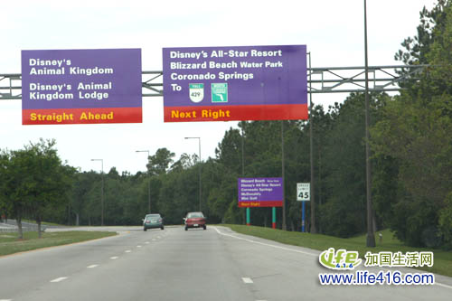 第四天一大早,我们照样在4号高速公路的65号出口下,然后按照彩色路牌的提示,向Animal Kingdom 进军。我们可是学乖了,路牌上怎么写的,我们就怎么开车,让“Straight Ahead”(直走),我们绝不“Turn Right”(右转)。