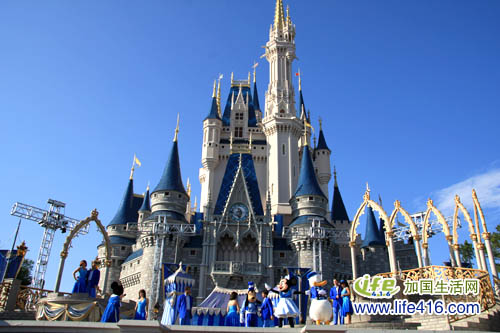 Magic Kingdom 正中央是的迪斯尼象征——那座充满着神话色彩的城堡,在这座城堡前,一年四季都上演着音乐剧“Dream Along With Mickey”。一场大雨过后,城堡上空的蓝天格外地蓝,城堡前的舞台上,米老鼠与唐老鸭、王子与公主们正卖力地在舞台上又唱又跳,他们用歌声和舞姿告诉舞台下的孩子和大人们:“每一个人都应该拥有梦想,每一个人都不要放弃梦想。一旦你拥有梦想,这里正是你梦想成真的地方”。