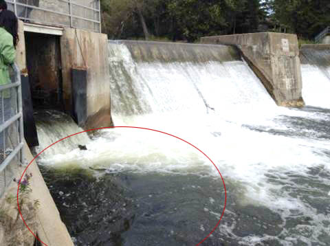 2014年10月9日最新鱼讯:小编亲自到Port Hope 看了一下最新的三文鱼回游的情况,鱼全都聚集在终点的坝上呢(Corbett's Dam),沿途的河里几乎看不到鱼,现在应该是三文鱼回游的尾声了。在坝上,三文鱼跳坝的场面很壮观,时不时地就能看到一条或几条三文鱼努力地跳坝的场面。想去Port Hope 看三文鱼回游的朋友们,建议直接去终点的坝上看吧。详细路线下面的文章里有说明。