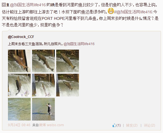 2014年9月24日最新鱼讯:加国生活网微博网友@Coolrock_CCF 发来的最新消息称port hope 河里的鱼比较少了,但是钓鱼的人不少,也容易上钩。估计能往上游的都往上游去了吧!水坝下面的鱼还是很多的。另外,还有一位粉丝也说河里没看见几条鱼。小编分析,三文鱼喜欢在河水上涨的时候回复,这段时间没有下雨,所以更多的三文鱼还等在湖里呢,等下一场雨后,河水上涨了,三文鱼就会拼命回游的。建议大家下一场雨后再去看。一般来说,三文鱼回游会持续1-2个月的时间的。
