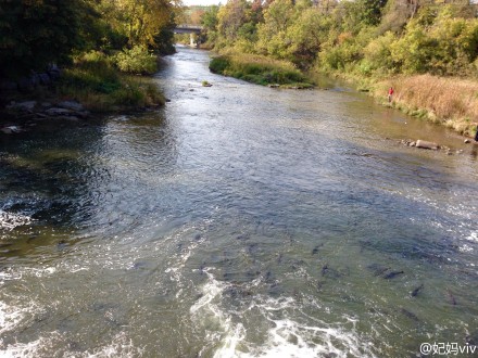 由于小编对朋友所说现在三文鱼已经回游的说法存怀疑的态度,以往三文鱼都是在9月中下旬回游的,今年的为什么那么早?9月10 日,小编专门去了趟多伦多的 Humber River 看三文鱼回游情况,河里偶尔有三文鱼回游,但很少,也没有跳坝的鱼,因此现在也只是三文鱼回游的开始阶段。小编估计再下几场雨,就会有更大批的三文鱼回游 了。
