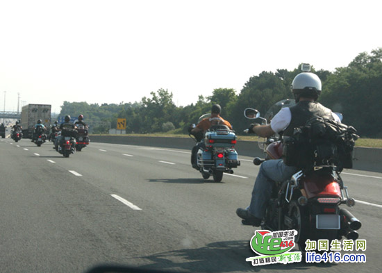在401高速还看到这样有趣的一幕:一群骑着高头大马摩托车的加拿大人正浩浩荡荡地行驶着,能有20多辆呢,小编估计他们是参加完Port Dover 举行的Friday the 13th活动的正往回返呢。西方人把13号看做是不吉利的数,再加上星期五更不吉利,但还却偏偏有加拿大摩托车爱好者专门挑属于星期五的13号搞活动,据主流媒体报道,上万人参加这个活动,Port Dover 小镇也因为这个活动火了……