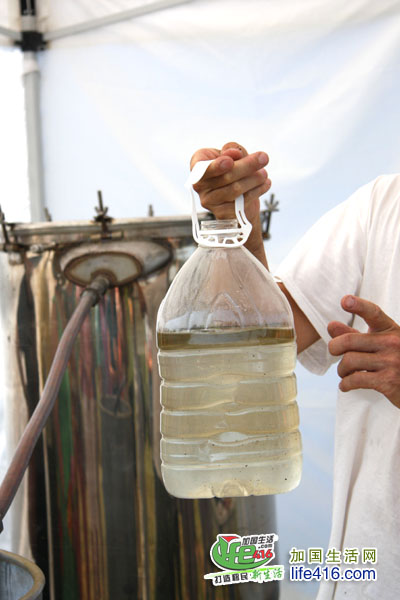 主人旁边的那个大的不锈钢罐子就是将收割下来的薰衣草制成精油和花水的仪器,经过高温蒸馏处理后,通过长长的管子后流到瓶子里,上面那一层就是薰衣草精油(Essential Oil),下面的水就是薰衣草水(俗称花水Hydrosol)。之后,农场还会将这两个产品分离并去杂质,最后变成成品精油和花水出售。主人很自豪地说,这个加工仪器还是他自己手工制作的呢,加拿大的男人许多都是这样心灵手巧外加能干的,呵呵。