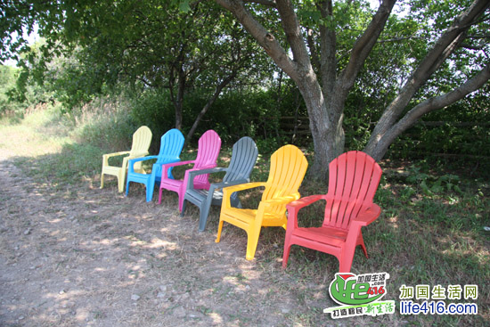 农场一旁的大树下,摆了一排五颜六色的椅子,妃妈viv 说这种椅子是安省特有的椅子,于是我们俩就坐在椅子上聊着天,闻着微风送来阵阵薰衣草花香,听着蜜蜂们忙碌着采蜜的嗡嗡声,那种感觉真好……