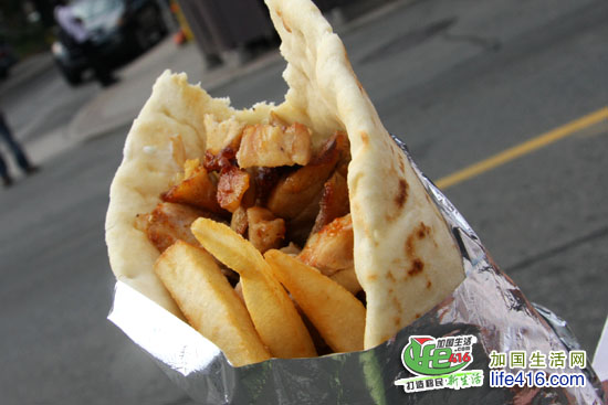 新鲜美味的Gyros 买到了!!咦?怎么中间少了一块?小编“不好意思”地汇报一下哈,实在忍不住美味,小编先咬了一口,才想起来拍张照片,哈哈……