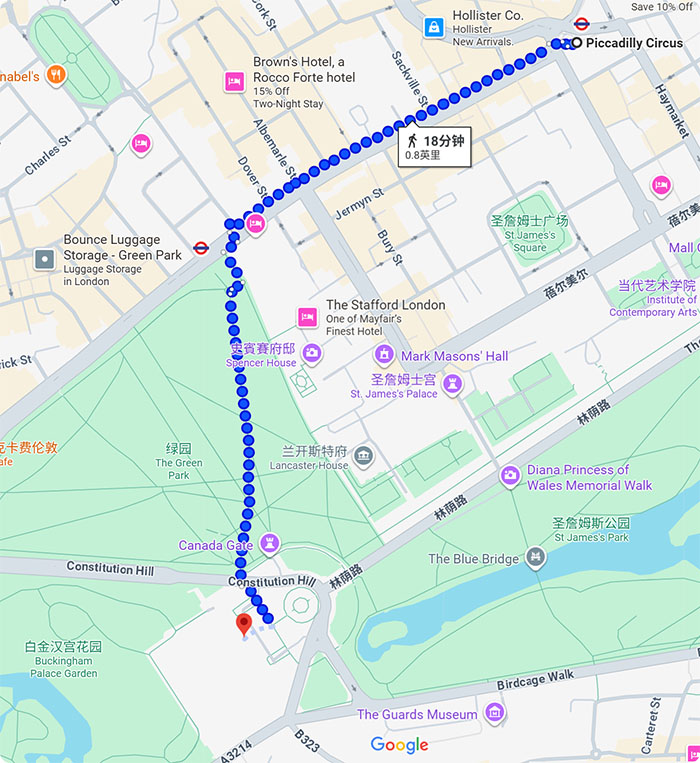 在分辨出东西南北后,我们决定走到附近的白金汉宫,步行大致需要18分钟左右