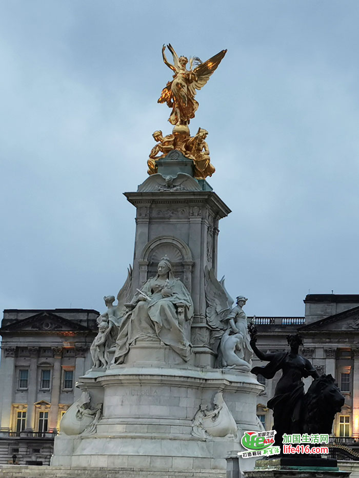 wiki了一下,这座雕像叫维多利亚女王纪念碑(Victoria Memorial),建于1911年,纪念碑的基座由2300吨汉白玉构成,底部是维多利亚女王的大型汉白玉坐像和正义和真理天使的雕像,顶端是鎏金的胜利女神和两个侍从像。主碑四周的基座由台阶和水池构成,基座四角各有一组人狮铜像。纪念碑四周有花坛点缀,整个区域叫做“女王花园”,女王花园背后(西南面)就是白金汉宫,正面(东北面)是林荫路。