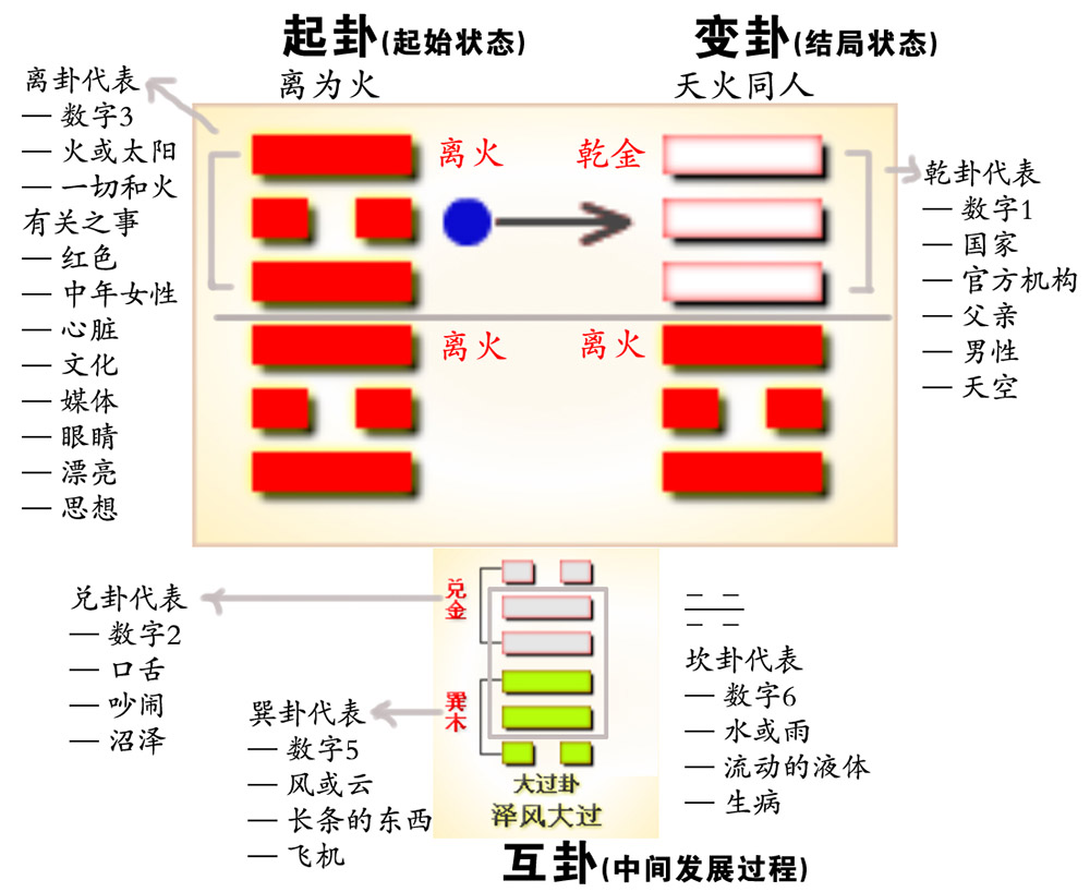 当我在看见救火车的那一刻,大脑中突然闪过一个灵感,震惊地想起临行前所起的那一卦。那一卦除了讲三个汉堡包、喝了两口酒所引发的“泽风大过”、过海关三次扫描护照、火水交融的英国天气,其实还讲了两次遇到火警的事情:起始卦的两个离火就是指会遇到两次火警;互卦中兑卦为二、巽卦为长条的东西也代表流动,是指两次流动(随着人流到户外避险);变卦乾卦为官方、离卦为火,官方和火相关的事情就是救火车,两次看见长条形的救火车。原来,梅花易数的卦是可以反复不断地去读的,因为这一卦能描述不同维度的事情,至于能读出多少信息来,就看个人的功力了(确实,这一卦还描述了我回国后所遇到的一些事情。如果你好奇,请尽情地展开你的想象力,想一想我还会遇到哪些事情……)。
