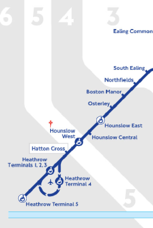 终于,我们坐上了返程地铁,本以为一个小时后就会回到了Terminal 4那一站,没想到中间又出了差子。我们看到来了一趟终点是Termianl 5的地铁,以为肯定会经过Terminal 4,便坐了上去。结果当我们坐了一个小时地铁、直接坐到终点Termianl 5,才发现这趟地铁根本就不经过Termianl 4。我们下了车,有些发懵,问了几个在站台等车的路人,要么不知道,要么不搭理。后来,终于遇到一个工作人员大姐,这才搞清楚原因。大家看上图,在经过Hatton Cross那一站后,地铁线会分叉出两条路,一条路经过Terminal 1,2,3后,终点是Termianl 5,但不经过Termainal 4;另一条路是先到Terminal 4后再经过Terminal 1,2,3。大姐说如果你们要到Termainal 4,只能坐回去到Hatton Cross那一站换车,等待去Terminal 4的地铁。