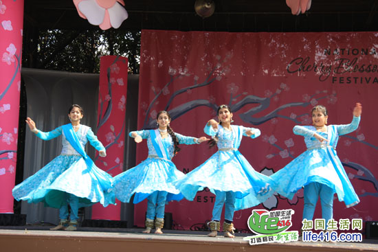 华盛顿纪念碑旁的舞台上,正在进行樱花节的文艺表演,各个民族的人们穿上节目盛装表演各自民族的舞蹈。这个是印度舞蹈。