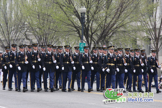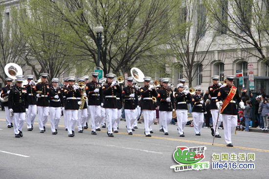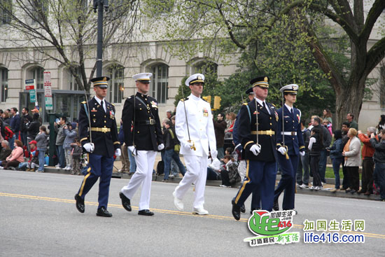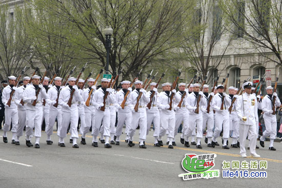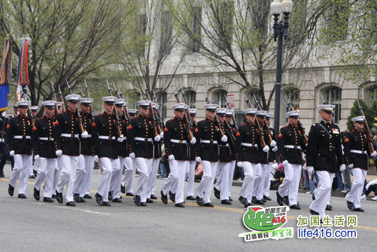 接着走来的是美国海陆空三军仪仗队和军乐队,随着仪仗队一个一个走过,道路两边响起了热烈的掌声,一些华盛顿人高喊“Thank you”,以感谢这些军人的保家卫国。