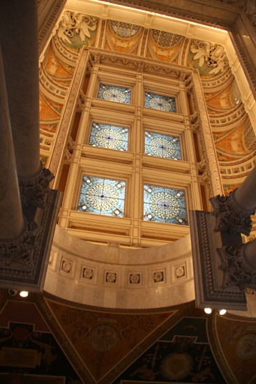 从国会大厦到美国国会图书馆有一条连接通道。在靠近图书馆通道的入口,有警察在进行安检,由于我们戴有已经安检过的胸卡,所以警察说我们不必排队,可以直接进入国会图书馆。
