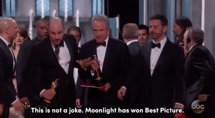 为纪念影片《雌雄大盗》上映50周年,昨日颁奖礼,该片男女主演沃伦·比蒂与费·唐纳薇上台为最后一个奖项“最佳影片”颁奖。唐纳薇首先念出了《爱乐之城》的名字。正当影片主创上台发表获奖感言三四分钟后,《爱乐之城》的制作人Jordan Horowitz突然发现问题,在台上澄清最佳影片其实应该是《月光男孩》。 众目睽睽之下,Horowitz说,“出错了,《月光男孩》,你们赢得了最佳影片。这不是在开玩笑。”