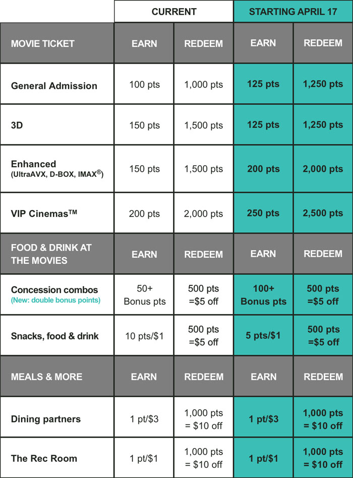 【加国生活网】加拿大最大的电影院Cineplex 近日宣布,将于2019年4月17日起更改其Scene 积分奖励政策,同以往政策相比,有些提高有些降低,而每看10次电影可免费看一次电影的政策仍未改变。
