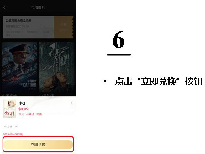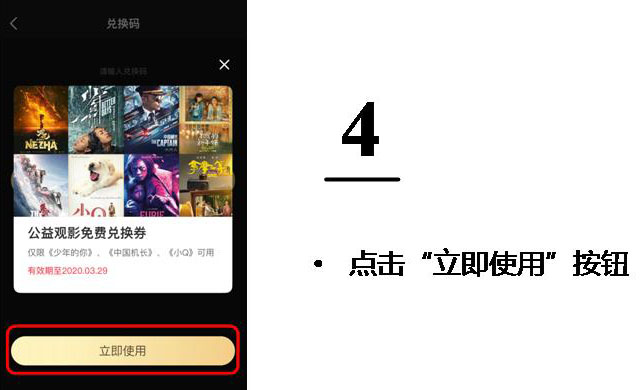 4、点击“兑换”后,看到如下“公益观影免费兑换券”,再点击“立即使用”。