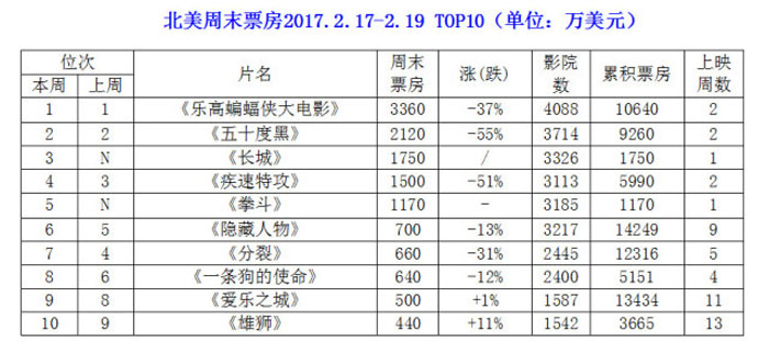 2017北美影市冬季档持续低温运转,本周一适逢美国总统日,形成长假期,因此上周末(2月17日至2月19日)又有三部大规模开画新片加入战斗企图挑战《乐高蝙蝠侠大电影》的票房霸主地位。然而,三部新片全部扑街。其中,《长城》境况尤为惨烈。这部耗资1.5亿美元的中美合拍大片登陆北美院线后却只产出了区区1700万美元的北美首周末票房,以200多万美元的微小优势击败《疾速特攻》,勉强拿了个票房季军。而另外两部新片,《拳斗》和《救命解药》同样首发失利。