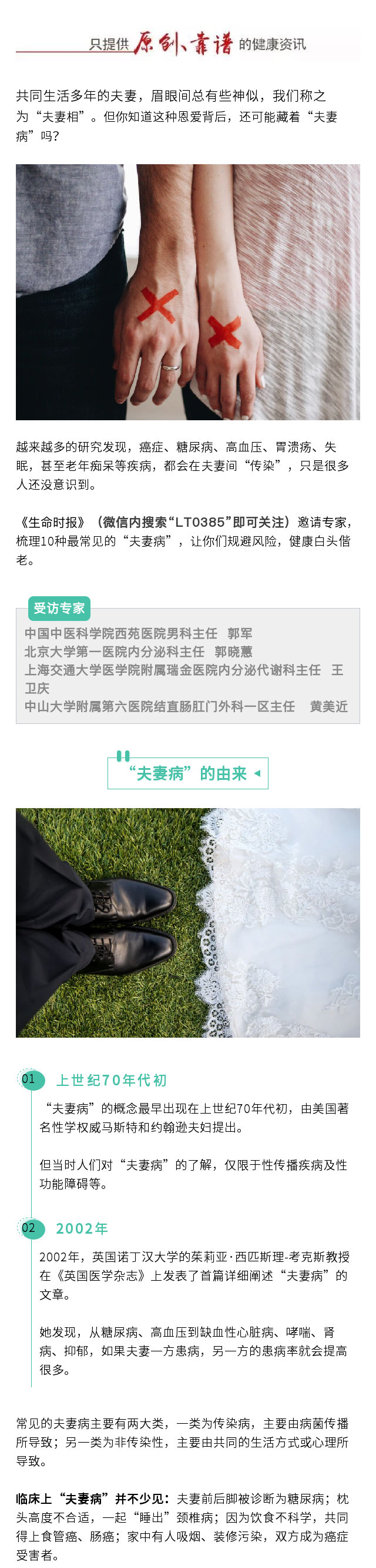一起生活多年的夫妻,眉眼间总有些神似,我们称之为“夫妻相”。但这种恩爱背后,还可能藏着“夫妻病”。越来越多的研究发现,癌症、糖尿病、高血压、胃溃疡、失眠,甚至老年痴呆等疾病,都会在夫妻间“传染”,只是很多人还没意识到。梳理10种最常见的夫妻病。