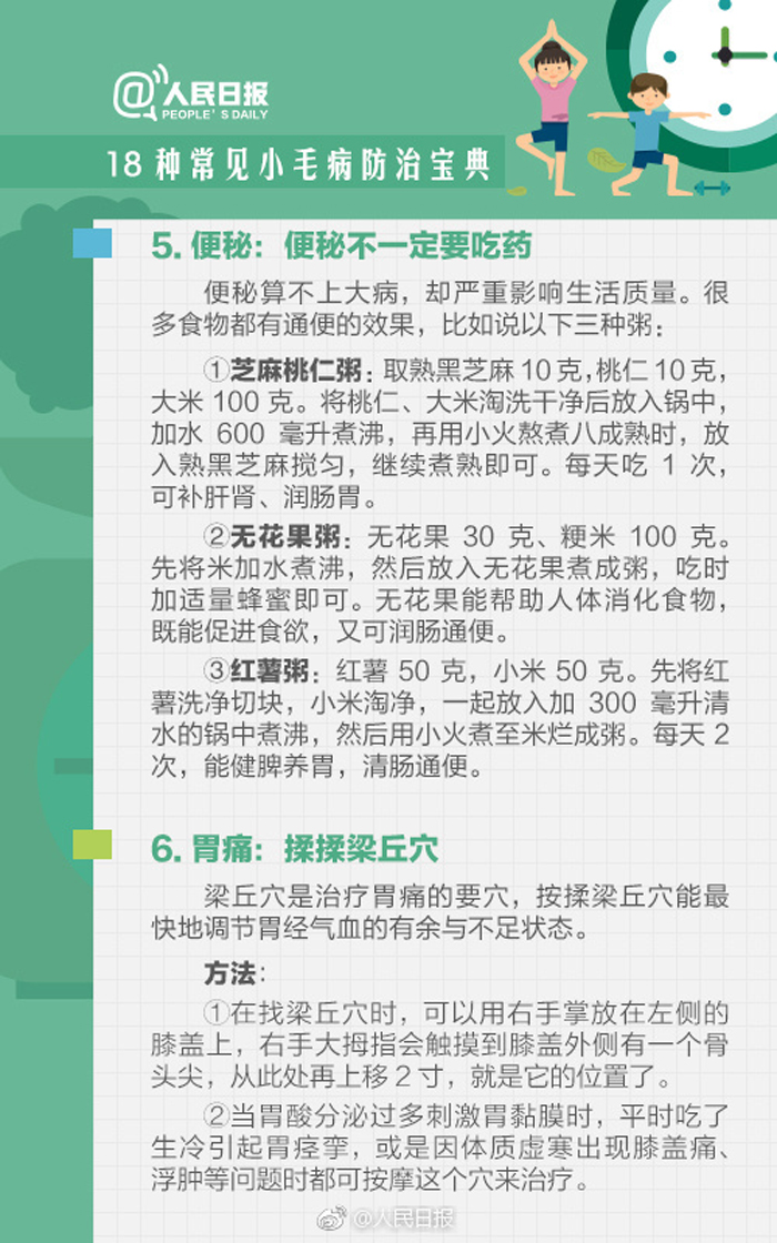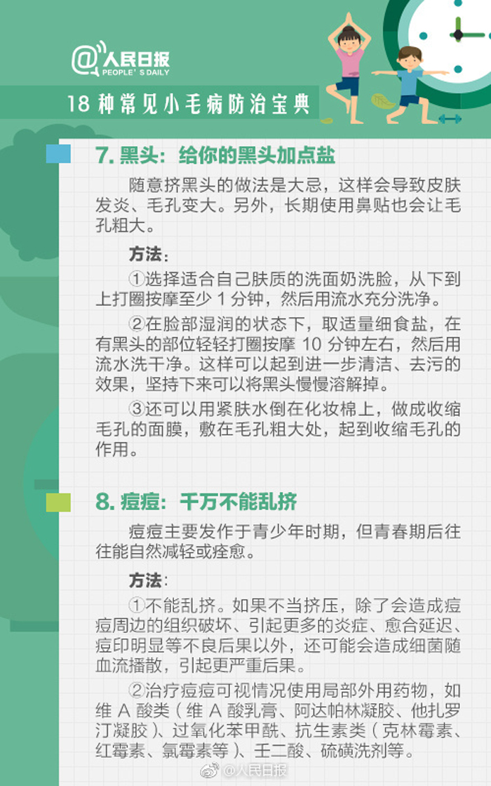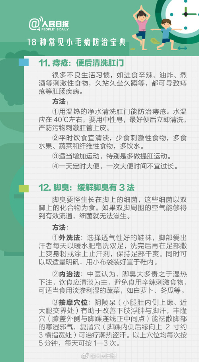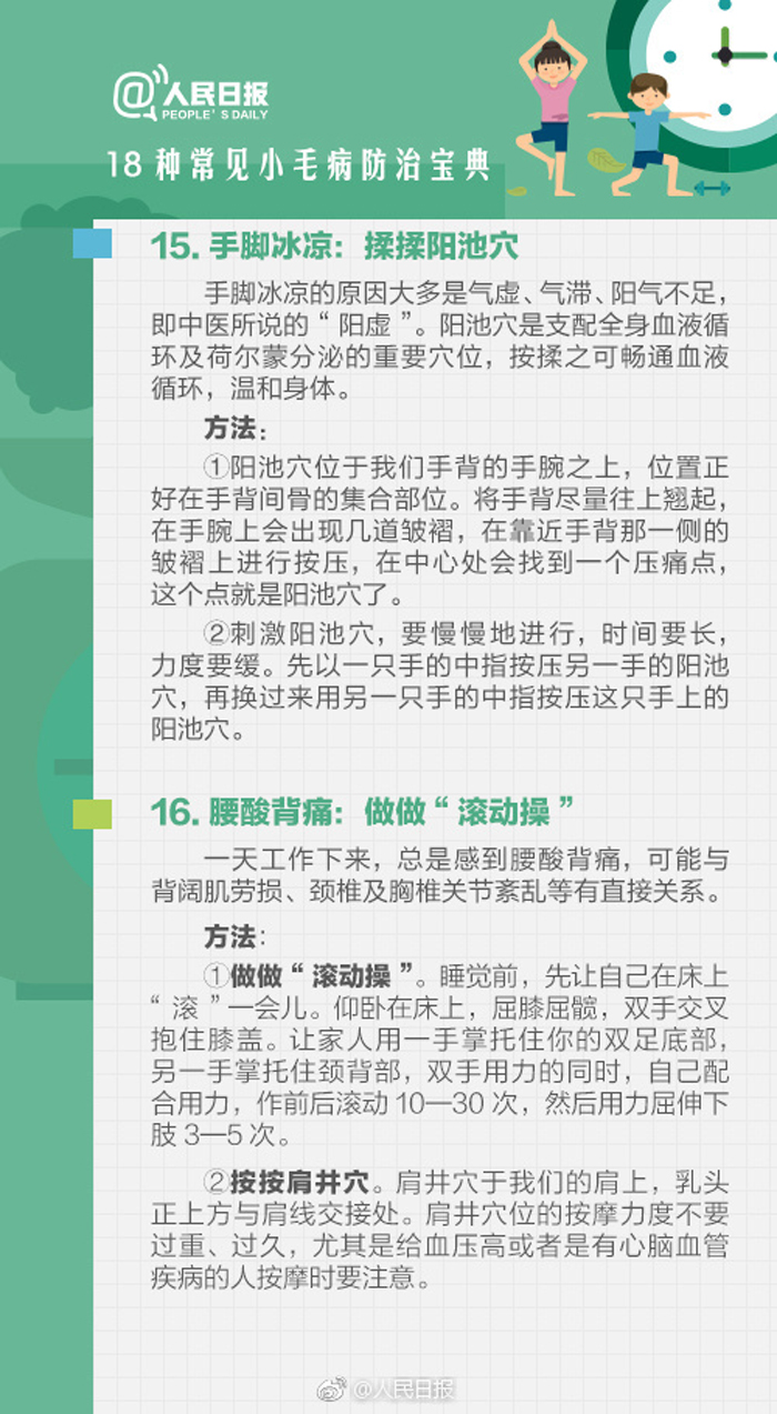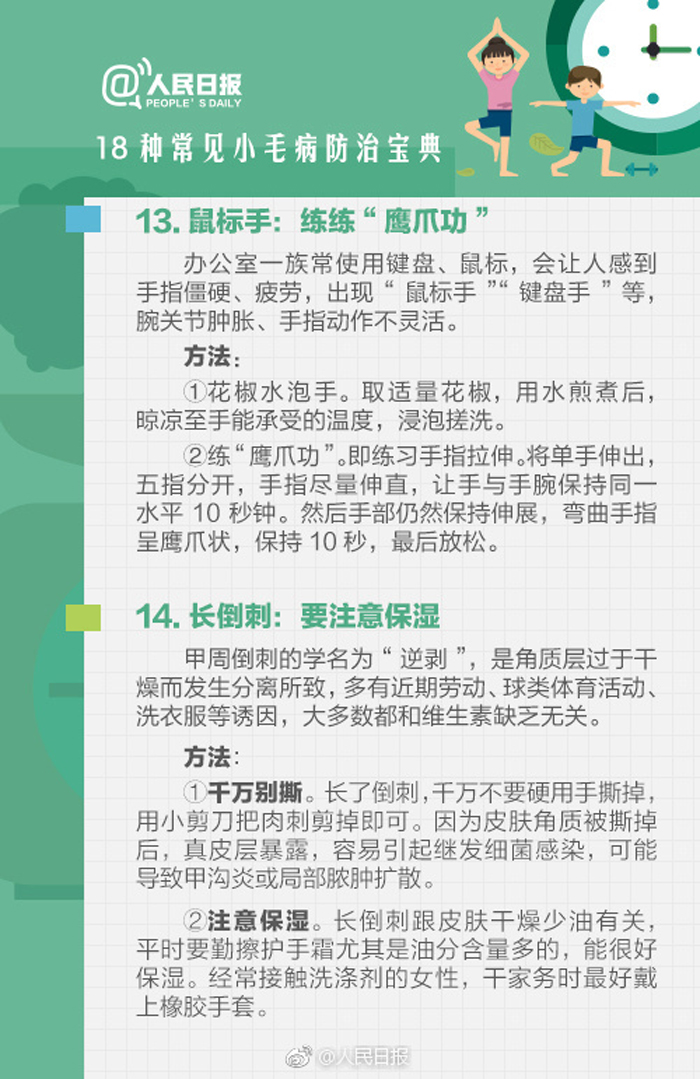 生活节奏快、工作压力大,身体难免出现些小毛病,可总往医院跑也不现实。想要小病不求人?送你18种常见小毛病治疗方法!感冒发烧38.5℃以下尽量先物理降温,皮肤过敏切勿用热水或面膜去刺激,长倒刺要用剪刀剪不能用手撕……为了家人的健康,学起!