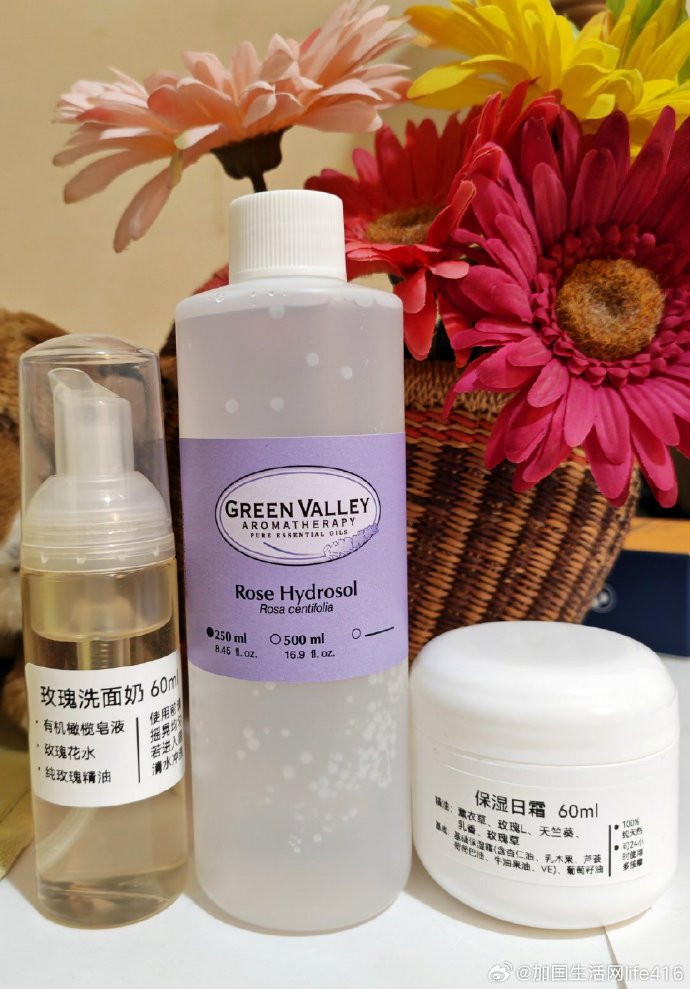 玫瑰系列保湿护肤,包括玫瑰洗面奶、玫瑰花水、保湿日霜