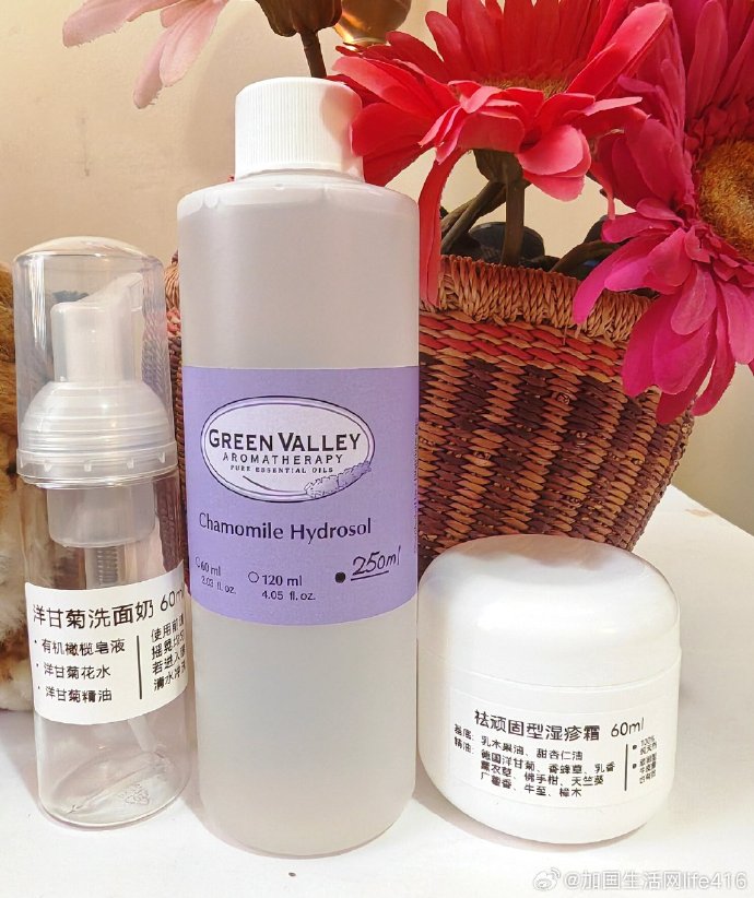 洋甘菊系列抗敏祛湿,包括洋甘菊洗面奶、洋甘菊花水、祛顽固性湿疹霜