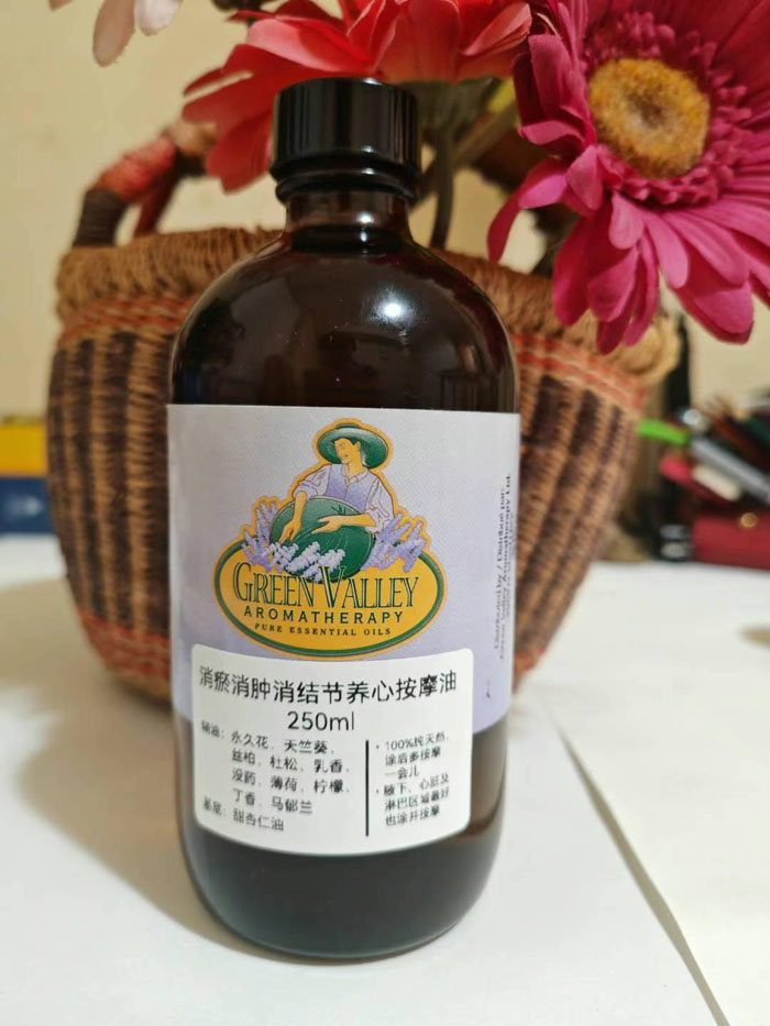 2024年2月28日:上次回国的时候,小编给老爸留了一瓶消瘀消肿消结节消痔按摩油,让他按摩全身。老爸说他用来按摩心脏,感觉很舒服,用得很快,已经用完了。这次小编专门给老爸配了一大瓶250ml的,在消瘀消肿消结节按摩油的基础上,额外多加了乳香和马郁兰精油,着重加强了针对心脏的精油,用来滋养心脏。2024年至2027,天地之间火的力量会越来越旺,会引发心脑血管疾病,老年人更是要要保护好心脏哟。自古以来,乳香精油被视为世界上最珍贵的精油之一。乳香精油具有多重效用,包括抗肿瘤、抗癌、抗衰老、抗抑郁、抗炎症、化痰、激发免疫力和镇静等,是有效的肺部杀菌剂。当您不知道选择什么精油时,选择乳香一定不会错。乳香配合其它精油使用时都有加倍提升功效的作用。受影响的身体系统:情绪平衡、免疫和神经系统、皮肤。|| 马郁兰精油是心脏的补药,能降低高血压。它的放松效果有助于改善头痛、偏头痛和失眠。马郁兰在安抚消化系统的效果相当闻名,有益于胃痉挛、消化不良、便秘、胀气,不能帮助身体排除毒素,并有益于胸腔传染病及感冒、鼻窦炎、支气管炎与气喘。在感冒时,能消除头脑的窒塞感,还能调节月经周期,减轻痛经。