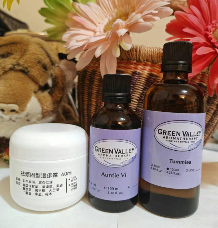 这批想自己配的朋友挺多,下图是顽固性湿疹霜全套精油: