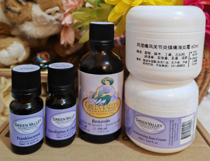 感觉有段时间没和大家介绍关节炎霜了,它适用的症状是风湿性关节炎、关节积水、痛风以及痛风引起的关节肿痛。如果是扭伤引起的筋骨疼痛也有效果。如果想根据自己的情况DIY配关节炎霜当然OK啦,想止痛效果多一些,可以多加安息香Benzoin精油,尤加利是消炎的,乳香前两图刚刚介绍完,大家自己去翻哈