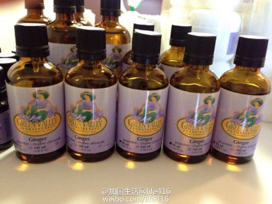 看,这是大家订的姜精油,有10ml、50ml、100ml的。姜精油绝对是好东西,象以上所述的可以和迷迭香花水配合在一起助长头发,没有迷迭香花水,也可以滴在矿泉水里,建议大家上午阳气盛的时候使用。姜精油还有一个重要功能就是排寒气暖胃祛痰,泡脚的时候滴10滴,泡到头出汗为止,对于胃寒、宫寒、湿疹、痘痘人群都很有好处。