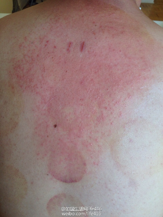 小编(2016年10月24日):以下这张照片是小编老公的湿疹,是的,他的湿疹又发作了,而且还挺厉害的,起在后背。这坏孩子有持无恐、NO ZUO NO DIE,还问呢,湿疹不是好了吗,为什么又起了?!小编其实天天都在和他讲,根据中医的五运六气的理论,2016年是水运之年,水多湿气大,特别容易积累不好的湿气,一定要少喝冰饮料、少吹空调,然并卵他偏偏不听,等湿疹犯了痒得难受皮都挠破了才老实了!!小编直接就用了牛皮癣霜并加上拔罐(每天晚上都拔一次,那一个个小粒粒里被拔出了许多黄水加血水),2周后痊愈。
