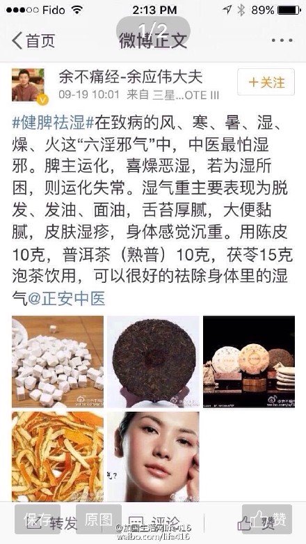 小编在微博看到一位中医推荐一款养胃茶:用陈皮10克、普洱茶(熟普)10克、茯苓15克泡茶饮用,对祛除身体里的湿邪有帮助。要知道原料很重要啊,现在的中药由于都是大棚种植的,在成长过程中还不断使用农药,造成药效差了许多。所以小编是不会用茯苓的,倒是陈皮可以自已制作。之所以自己制作,也是因为现在市场上的陈皮药效都不行,小编有次回国陪老爸去中药店买陈皮,1-2块人民币1两,一点陈皮味都没有,就算买十斤也抵不上一两好陈皮。