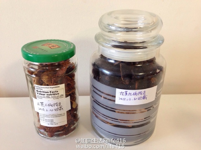 加国生活网小编编后按:有网友问做好的陈皮要如何用?泡茶、做粥、煲汤都可以用,还有网友反馈说把这段时间正在按照加国生活网网站介绍的办法制作“九蒸九晒”陈皮,还只是做到“三蒸三晒”,把“半成品”陈皮放到红烧肉里,味道就很香了,哈哈,是的,“九蒸九晒”陈皮需要好久的时间,可以一开始制作一批“三蒸三晒”陈皮马上使用,或者放一二个月后再使用,再慢慢制作“九蒸九晒”陈皮,再长时间储藏。