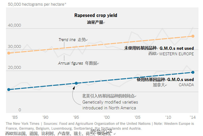 图表显示的是近30年间油菜在西欧(常规品种)和加拿大(转基因品种)的产量(每公顷的产量),可以看出两个区域的油菜产量增速相同,转基因技术的引进并没有让北美的油菜产量表现更好。