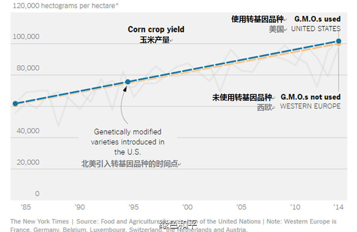20年前,转基因作物在位于北美的加拿大和美国开始规模化推广,与此同时,西欧国家并没有将其应用于农业生产,对比北美和西欧几种作物(北美种植的为转基因品种,西欧种植的是非转基因品种)从1985年至2014年的产量表现,转基因作物的增产速度没有优势,甚至落后于非转基因品种。美国科学院近期的一份报告也表示:“几乎没有证据表明”美国使用转基因作物后,增产水平超过常规作物。