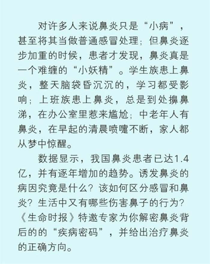 对许多人来说鼻炎只是“小病”,甚至将其当做普通感冒处理;但鼻炎逐步加重候才发现,它真是一个难缠的“小妖精”。诱发鼻炎的病因究竟是什么?如何区分感冒和鼻炎?生命君特邀专家,为你解密鼻炎背后的的疾病密码,并给出治疗建议。
