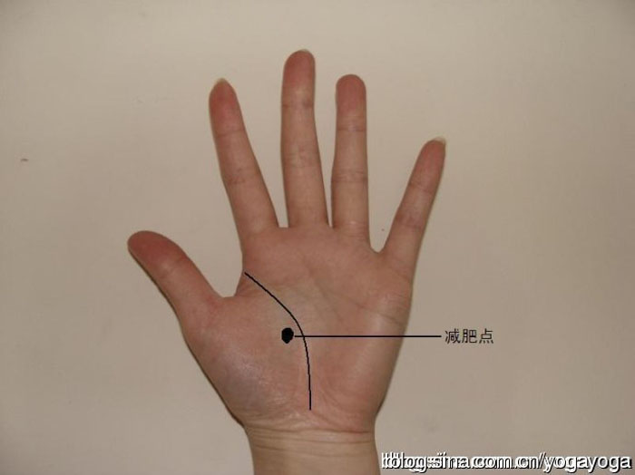 速效健脾减肥点:取手掌生命线中间点,稍微往里(拇指方向)移一厘米的位置,用力按,很痛表明肠胃功能不太理想。这里有一根筋,如果能找到的话,就左右的拨动它,效果更好,先左后右手,持续刺激十分钟,十分之三的人会在第两三次以后就有明显的胃口改变,重刺激抑制食欲,轻柔刺激提升食欲。