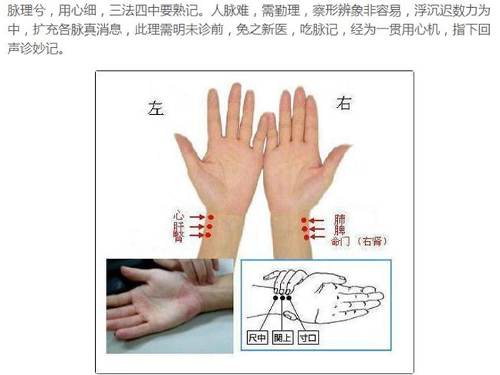 号脉中左手寸脉能摸到 代表心脉正常 摸不到说明心血不足 大多都有心悸 接不上气的现象。