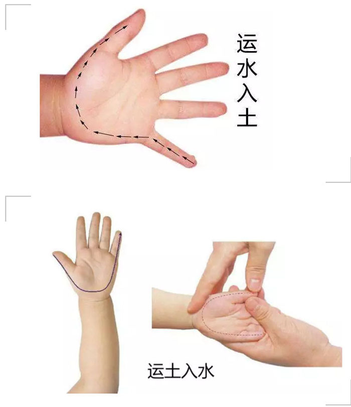 和成人相比,小孩子还没有长成型呢,也就是中医所说的脏腑娇嫩,形气未充。如果家里有小孩子,我们就会特别注意:这个温度小孩子会不会冷啊,这个风会不会吹到小孩子啊。因为小孩子未发育成熟,所以发病容易,传变迅速。不过好在由于小孩子脏气清灵,易趋康复。所以啊,不管是治病还是保健,推拿对于小孩子来说真真儿是再好不过了。今天我们继续为大家介绍小儿推拿的穴位运土入水与运水入土。