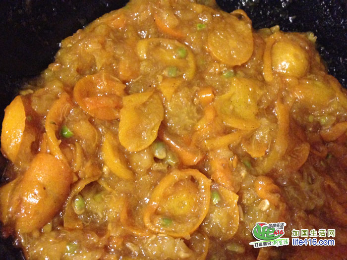 5、如果太稠了,可以一边炒制一边少加一些水,里面的果胶就一点一点在融化,金桔酱一点点在变软。这个过程大约需要一个小时左右。