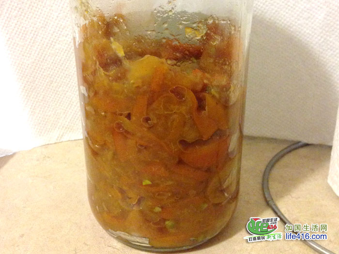 6、当金桔酱由金黄色变成熟黄色了,放一点蜂蜜,就可以出锅装瓶了