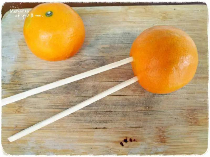 用筷子把橘子固定。这样烤起来不烫手呀不烫手。