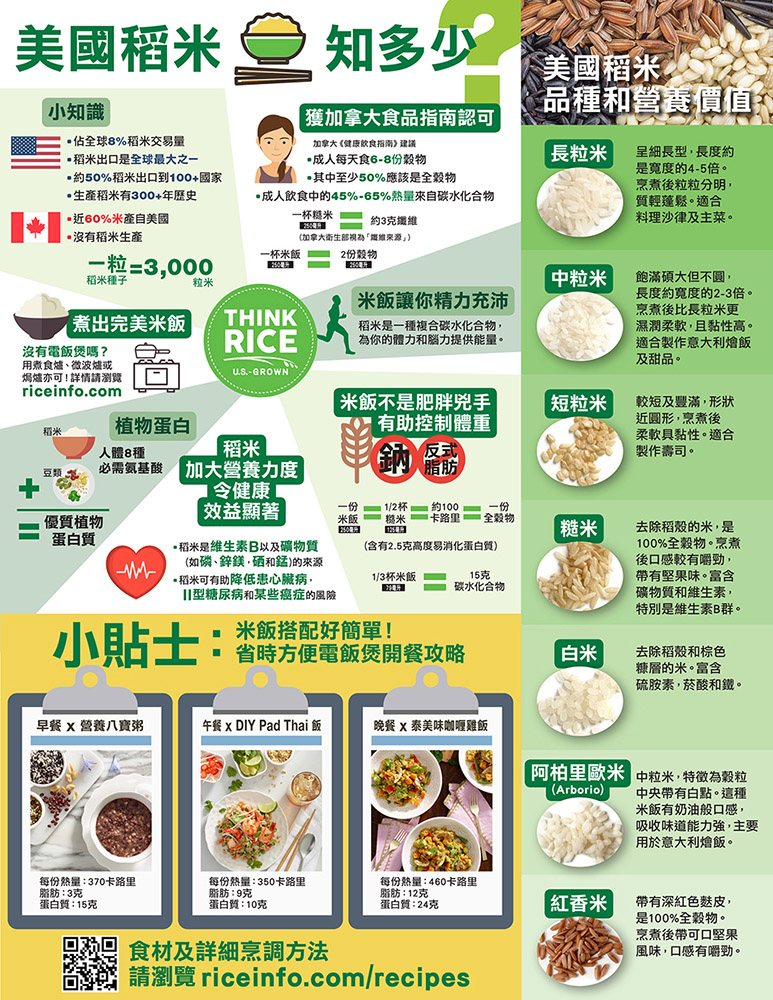 稻米符合加拿大食品指南,搭配蔬菜、水果、蛋白质以及豆类,为你完备膳食。
