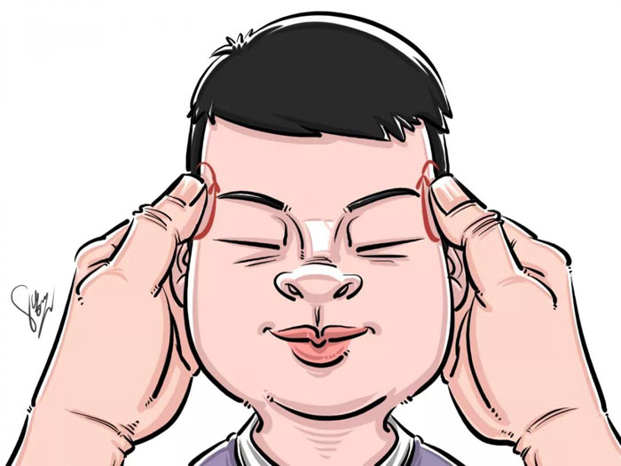 在两侧眉梢与眼角延长线相交处,眉后凹陷中,用中指指端揉之,为揉太阳,50~100次,可力道稍重。