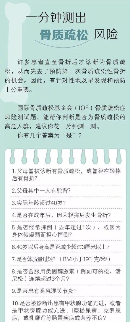 骨质疏松是一种寂静的流行病,据调查,女性一生发生骨质疏松性骨折的风险(40%)高于乳腺癌、子宫内膜癌和卵巢癌的总和;男性一生发生骨质疏松性骨折的风险(13%)高于前列腺癌。《生命时报》采访骨科专家,教你养出健康骨骼。