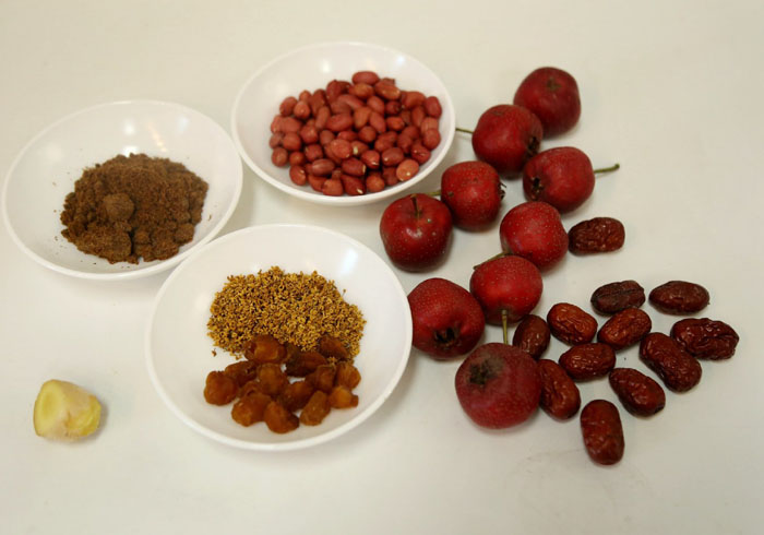 鲜山楂100克、桂圆干20克、小红枣12粒、花生30克、桂花一小把、红糖25克、生姜一小块、水1000毫升。