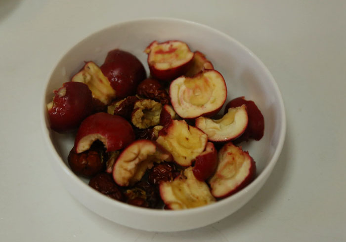 鲜山楂100克、桂圆干20克、小红枣12粒、花生30克、桂花一小把、红糖25克、生姜一小块、水1000毫升。
