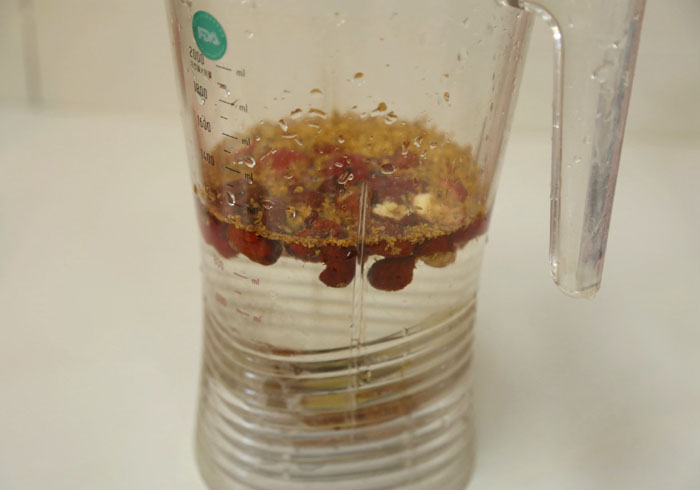 5、破壁机桶里加入山楂、桂圆、红枣、桂花,加入1000毫升水。