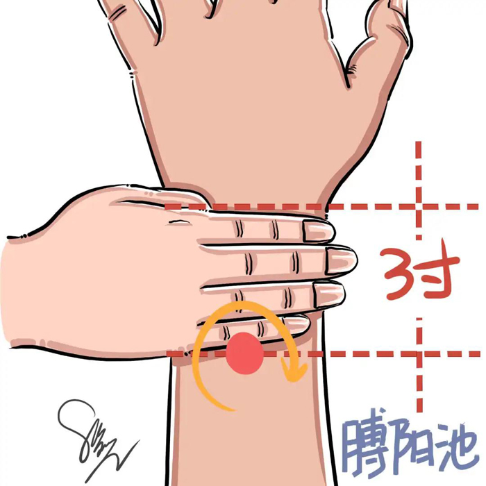 阳池,在腕背横纹上3寸,尺桡骨之间。家长的一只手握住持小宝宝左手腕,另一手的拇指端按揉穴位,有清脑开窍的作用。