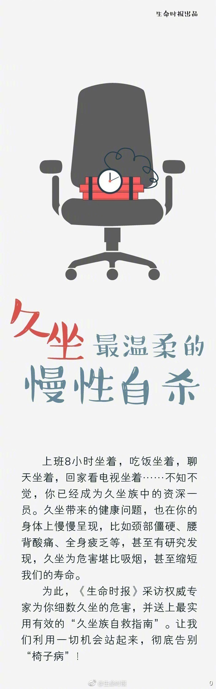 上班8小时坐着,吃饭坐着,聊天坐着,回家看电视坐着……不知不觉,你已经成为久坐族中的一员。久坐带来众多健康问题,如颈部僵硬、腰背酸痛,甚至会缩短寿命。《生命时报》采访权威专家,送上自救指南,助你彻底告别“椅子病”。